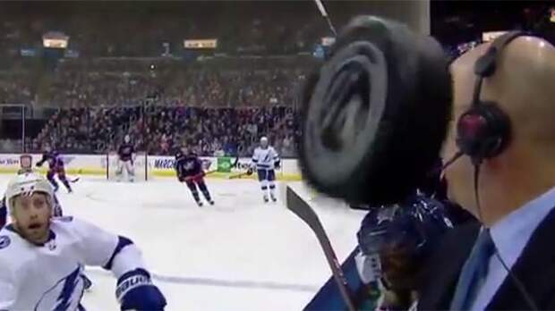 Комментатор Пьерр Макгваер избежал чудовищной травмы во время матча регулярного чемпионата Национальной хоккейной лиги между "Тампа-Бэй Лайтнинг" и "Коламбус Блю Джекетс".