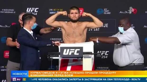 При этом прежде, чем подняться на весы, Нурмагомедов разделся, а сотрудники UFC прикрывали его полотенцем.На дуэли взглядов "Дагестанский орел" традиционно предстал в папахе, а Гэтжи вышел к сопернику в бейсболке.