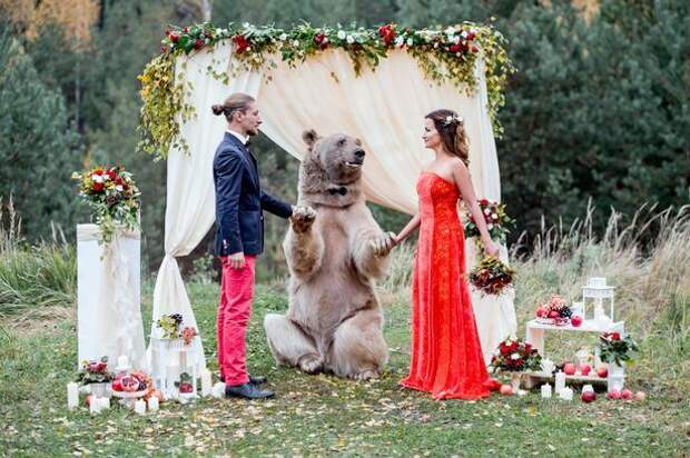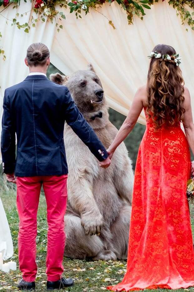 Молодожены из Москвы устроили свадьбу с медведем. Как пишет Mirror, одомашненный медведь зрелищно выглядел в роли брачного регистратора.