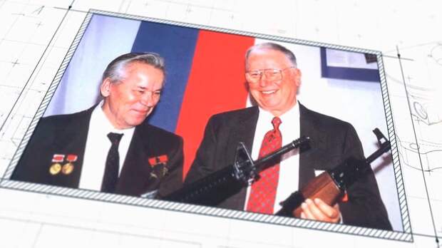 Скриншот видео Для фотосъемки знаменитые изобретатели обменялись оружием. Оба самоучки без высшего образования. Оба навсегда изменили мир стрелкового вооружения, разбив его на два лагеря – тех, кто использует АК и М16. Эти стволы стали самыми популярными в мире моделями автоматического оружия.