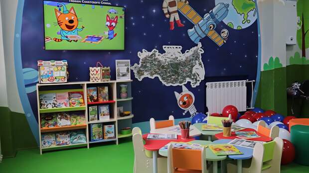 В комнате они могут рисовать, читать, играть и отдыхать от медицинских процедур. Интерьер выполнен в теплых тонах и патриотичной гамме. Пространство оснащено книгами, а также игровыми и развивающими секциями.