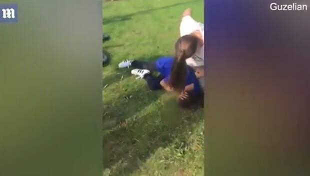 На кадрах девушка в возрасте около 14 лет с кулаками набрасывается на свою жертву, повалив ее на газон.