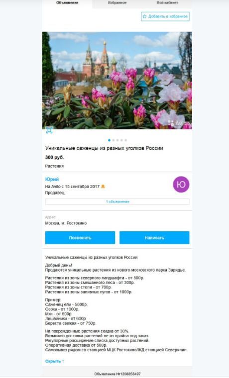 "Про растения из "Зарядья" было единичное объявление, которое было заблокировано модерацией", — цитирует РБК пресс-службу Avito.