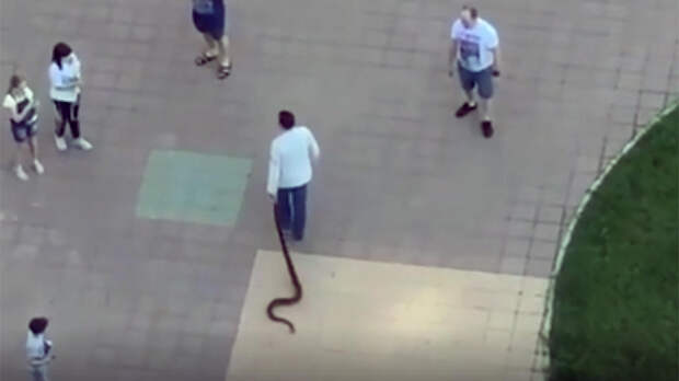 Эти пугающие кадры сняли очевидцы в Подмосковье. Трехметровая змея извивается рядом с маленькой девочкой. Ребенок на удивление спокоен как удав. Спокоен и хозяин удава. Вот он берет за хвост рептилию и тащит по брусчатке словно игрушку. Так он выгуливает своего питомца. А ведь вокруг десятки детей и мам с колясками. Этот сквер - самое популярное место отдыха в районе. И выгуливать животных здесь запрещено. Правила черным по белому написаны на этой табличке. Вот только мужчина почему-то наплевал и на закон, и на жителей.