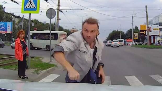 Увидев приближающийся автомобиль, мужчина остановился, бросил свирепый взгляд на водителя и ударил кулаком по капоту.