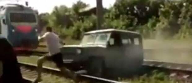 В Амурской области очевидцы сняли на видео спасение водителя внедорожника УАЗ, который застрял на железнодорожных путях. Ролик опубликован в Сети.