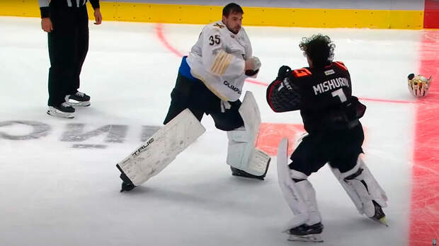 В третьем периоде матча вратари Андрей Мишуров ("Авангард") и Адам Хуска ("Адмирал") неожиданно покинули свои ворота и устремились к центру площадки.