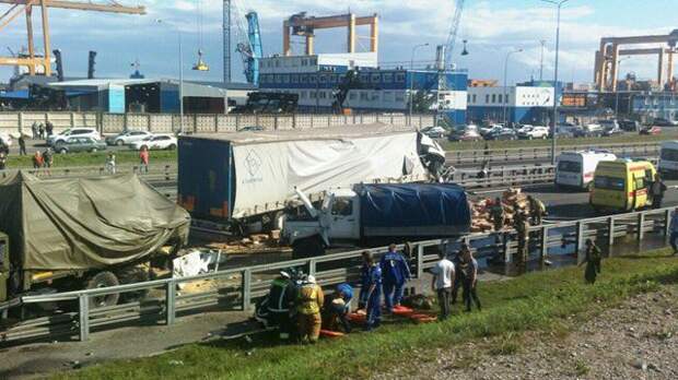 В Кронштадтском районе Петербурга на КАД произошло ДТП с фурами и двумя грузовиками, в которых находились военнослужащие.
