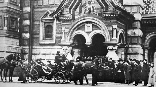 Экипаж японского принца Куни стоит у храма Воскресения Христова (Спас-на-крови). РИА Новости «Он возводился очень долго - 24 года - в силу своего очень богатого сложного убранства и в силу своей постановки на берегу канала. Александра II революционеры-народовольцы убили у самой решетки набережной, и, когда произошла трагедия, кусочек набережной был сохранен. Над ним сначала стояла часовня, а потом уже начали возводить храм, как раз эту мостовую сохранили. Когда строился собор, по задумке и императора, и архитектора, храм заключил под своды самое памятное место», - рассказала Светлана Климова.