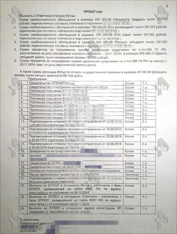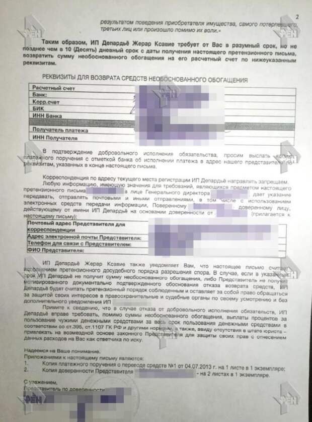 В исковом заявлении, которое оказалось в распоряжении журналистов РЕН ТВ, имеется информация о 4 платежах на общую сумму в более чем 1,5 млн рублей. Предполагается, что Депардье подавал несколько исков. Ранее появилась информация, что актер требует от бизнесвумен более 7 млн рублей.