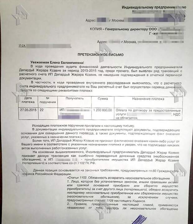 На нее зарегистрировано несколько фирм.В претензионном письме говорится, что в ходе проведения аудита за период с 2013 по 2015 год был выявлен ряд денежных переводов со счета Депардье якобы за то, что компания Лазаревой ООО "ГлавБухАудит" оказывала ему ряд юридических услуг. В письме говорится, что транзакции не нашли подтверждения в отчетной документации. Сам Депардье уверяет, что фирма не оказала ему каких-либо услуг.