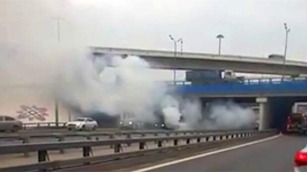 На кадрах видно, что экстренные службы занимаются ликвидацией возгорания грузовика. Движение на обеих сторонах участка кольцевой дороги, где работают пожарные, затруднено.