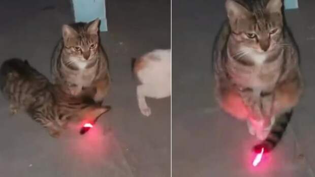 На этих кадрах запечатлено, как человек наводит лазерную указку, играя с животными. Два кота с удовольствием охотятся за красной точкой, однако третий питомец спокойно сидит на месте и не обращает ни на что внимания.