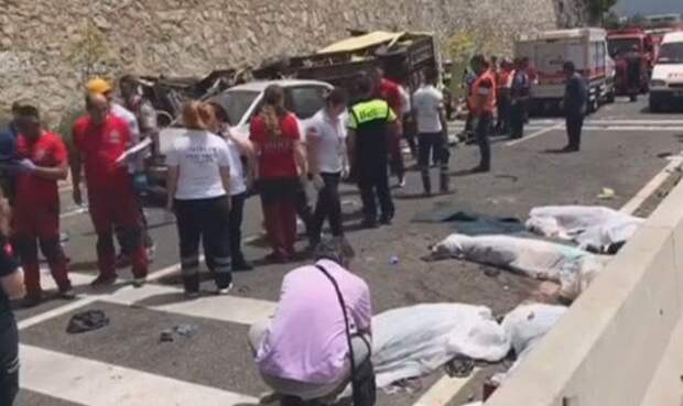 Водитель, выполняя маневр на опасном повороте, не справился с управлением, в результате чего машина перевернулась.Правоохранители выясняют причины трагедии. Как уточнил губернатор Имер Чичек, все погибшие являются гражданами Турции. В больницы были госпитализированы 11 человек, они находятся в тяжелом состоянии.