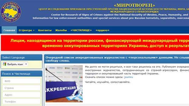 Как подчеркивается в публикации, в список вошли фамилии журналистов, "сотрудничающих со страной-агрессором".В списке "Миротворца" значатся фамилии журналистов из Украины, Франции, США, Китая, Германии, Великобритании и других стран.