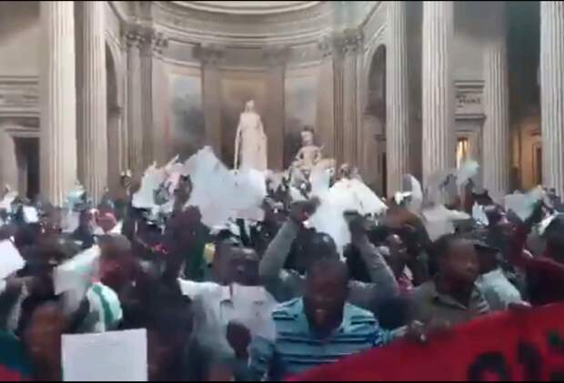 Протестующие, в основном выходцы из Африки, танцуют и размахивают бумагами, передает Франсинфо.