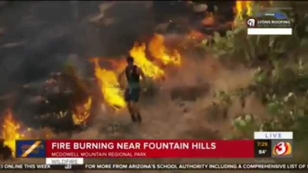 В штате Аризона (США) мужчина попытался потушить природный пожар, затоптав его. Видео с места происшествия показали в сюжете на местном телеканале.