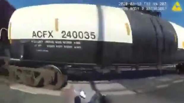 В США полицейский спас из-под колес поезда инвалида-колясочника, застрявшего на железнодорожном переезде. Видео с места происшествия появилось в Twitter.