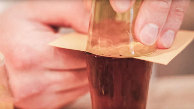 "Нам понадобится вот такая перегородочка, которая позволит нам, в принципе, перевернуть стакан, поставить один стакан на другой. Коньяк у нас начинает подаваться наверх. Почему? Потому что плотность у коньяка меньше, чем у сока. Вот, а плотность сока больше, и мы видим, что у нас жидкость наверху темнеет, внизу светлеет", – показал физик Серафим Щеглов.