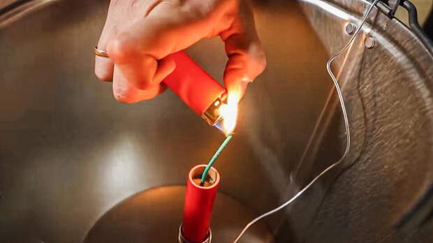 "У нас две одинаковые петарды. Собственно, вот в этом ведре она закреплена на проволоке для того, чтобы она была в пустом пространстве. А это петарда с грузиком. Грузик нужен для того, чтобы она утонула в воде", – подчеркнул экспериментатор Артем Егиазаров.
