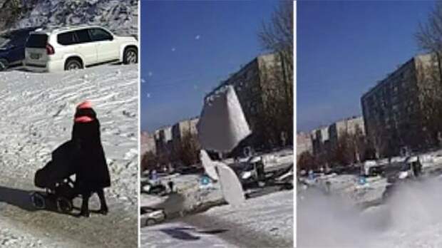 На этих кадрах можно увидеть, как девушка спокойно идет с коляской, когда неожиданно в нескольких метрах от нее впереди падает глыба.