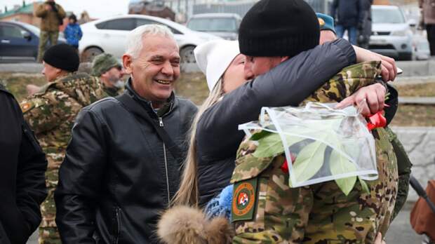 Бойцов встречали родственники, военный оркестр, представители молодежных организаций и участники третьего набора в добровольческий отряд "Тигр", которые отправятся в зону СВО.