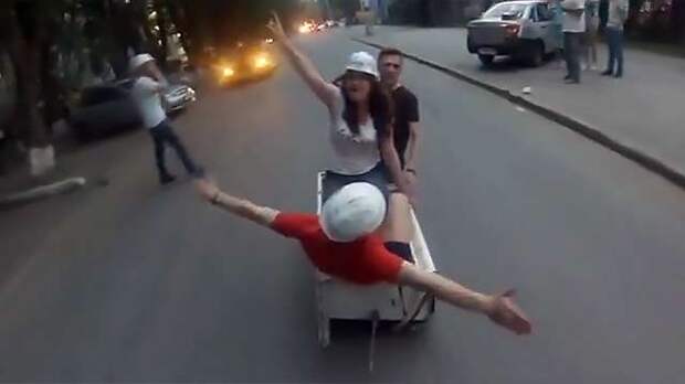 После аварии трос, который крепил холодильник к автомобилю, порвался, и выпускников не потащило дальше. Наездники даже надели каски, однако не закрепили их как следует, …