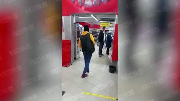 Заметив съемку, неадекватный мужчина сперва бросился на кассира, чтобы выбить телефон из рук, а после вдребезги разбил стеклянную дверь продуктового.