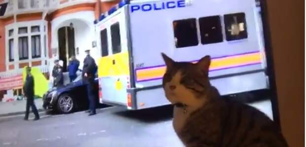 Известный в соцсетях кот основателя WikiLeaks Джулиана Ассанжа наблюдал за арестом хозяина по телевизору. Видео в Сеть выложила в Twitter организация WikiLeaks.