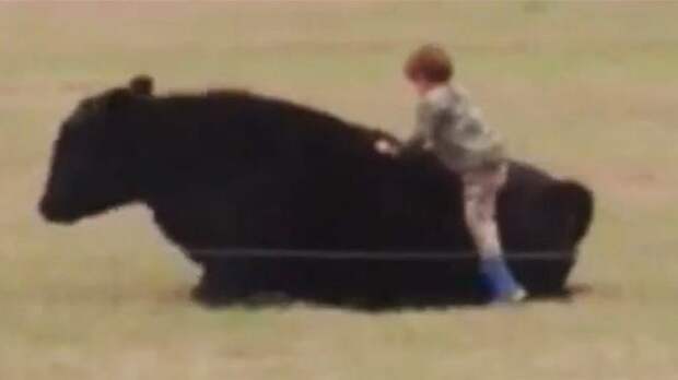 Маленький мальчик на спор запрыгнул на спину быка после того, как отец пообещал ему за это 20 долларов.