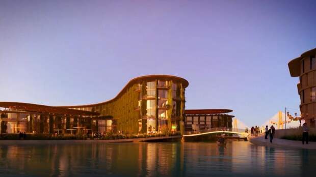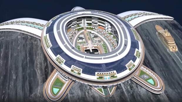 Скриншот видео В плавучем городе будут жить 12 тысяч человек. Чтобы им были не страшны наводнения и цунами, острова будут подниматься и опускаться вместе с уровнем воды. Вот только от постоянной качки среди жителей может начаться эпидемия морской болезни.