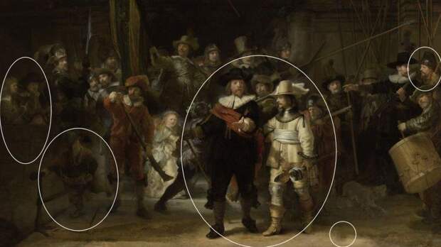 Искусственный интеллект помог искусствоведам восстановить легендарную картину Рембрандта, известную под неофициальным названием "Ночной дозор" (настоящее название - "Выступление стрелковой роты капитана Франса Баннинга Кока и лейтенанта Виллема ван Рейтенбюрга". - РЕН ТВ).