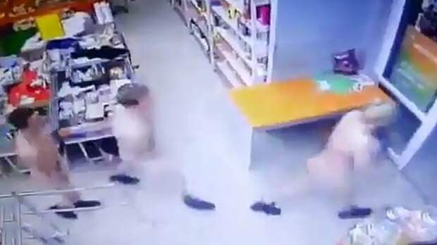 Двое мужчин и девушка забегают в торговый зал в ЯНАО — на них нет никакой одежды, тела прикрывают руками, сами, не говоря ни слова, останавливаются у касс и смотрят друг на друга.