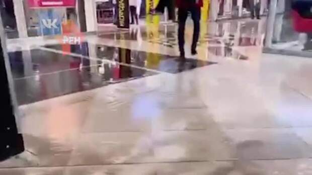 На кадрах видеозаписи, опубликованной в Сети, запечатлено, как посетители и сотрудники ТЦ оказались почти по щиколотку в воде. Не помогла ситуации даже остановка вращающейся двери на входе в торговый зал.
