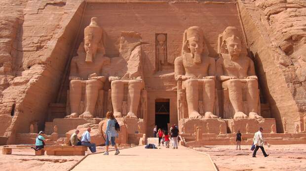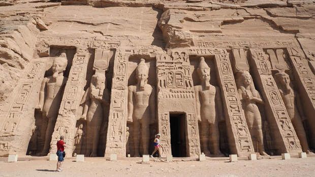 Этот храм находится на берегу озера Насер в Абу-Симбеле (Нубия) в пустыне и состоит из двух частей, одна посвящена Рамзесу II, а вторая – его жене Нефертари. Громадные фигуры богов Амону, Ра-Хорахте и Птаху, правителя Рамзеса II и Нефертари высечены прямо в скале, высота которой достигает сотни метров, сами фигуры – по 20 метров. Несмотря на труднодоступное расположение, храм способен впечатлить не меньше, чем пирамиды. Святыню возвели в 1244 году до н. э в честь победы Рамзеса над хеттами. В середине XX века храм перенесли на возвышенную местность из-за строительства Асуанского гидроузла.