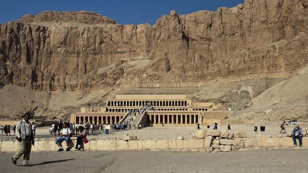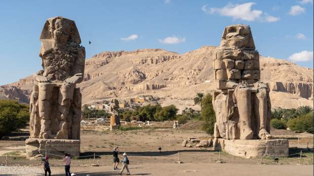 Колоссы Мемнона – это две гигантские каменные скульптуры, изображающие фараона Аменхотепа III. Колоссы расположены на берегу реки Нил около города Луксор. Фигура правителя изображается сидящей со сложенными на коленях руками, голова повернута на восходящее солнце. Оба памятника высотой 18 м. Раньше колоссы «охраняли» вход в грандиозный поминальный храм Аменхотепа III. Считается, что храмовый комплекс занимал площадь в 35 га. Согласно версии греческого историка Страбона, северный колосс в 27 году до н. э. был расколот землетрясением, после чего получил репутацию «поющего». На рассвете он начал издавать звуки, похожие на стон или посвистывание