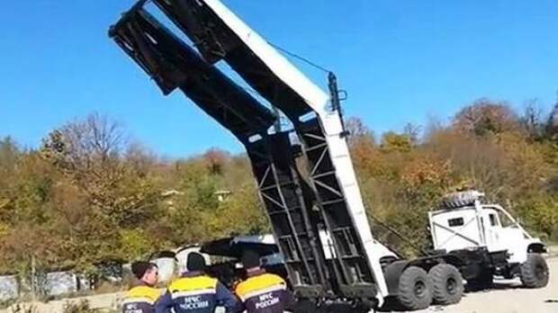 Сотрудники МЧС приступили к установке временного моста через реку Туапсе в село Кирпичное на Кубани. Он будет служить для автомобилистов во время ремонта основного моста, который накануне был поврежден непогодой.