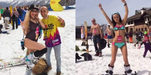 В Сочи состоялся фестиваль-карнавал "BoogelWoogel". Более тысячи лыжников в купальниках спустились сегодня со склонов курорта "Роза Хутор".