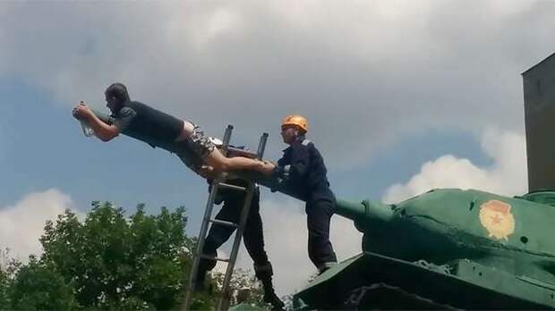 Мужчина забрался на пушку танка, установленного в память о гвардейцах-танкистах на улице Красноармейской, закрепил к ней ремень и зафиксировал его на своей шее.