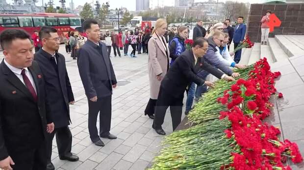 Представители КНДР 2 мая прилетели во Владивосток и возложили цветы к Вечному огню мемориала "Боевая слава Тихоокеанского флота".