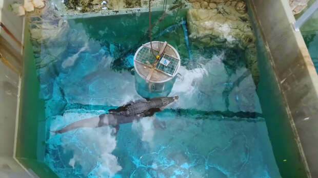 Причем крокодилы с большим интересом подплывают к хрупкому укрытию – рядом с ним сотрудники специально проводят кормежку.