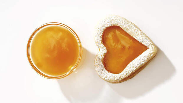 Песочное печенье с кисло-сладкой сахарной помадкой и абрикосом, выполненное в виде яичницы.