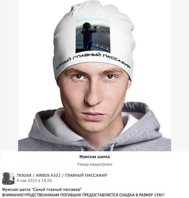 Малышку в СМИ прозвали "главным пассажиром". Перед поездкой в Египет молодые родители девочки выложили в Сети снимок с изображением девочки в аэропорту и подписали его: "главный пассажир".Администраторы группы предлагают купить шапку по цене в 1228 рублей. Еще более кощунственным оказалось предложение родственникам погибших при крушении А-321 о скидке в 15 % на свою продукцию.