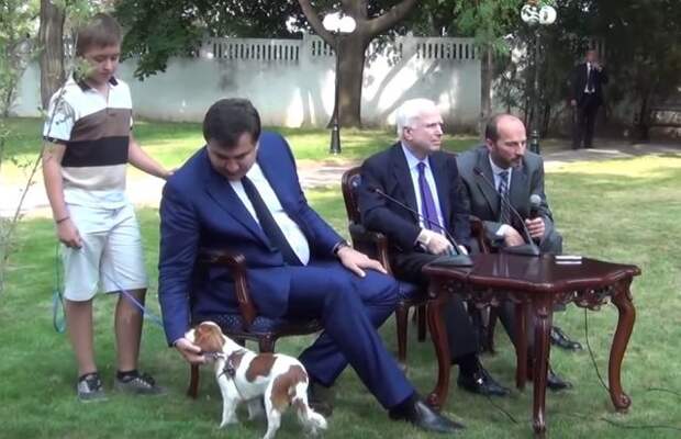 Бывший президент Грузии во время выступления Маккейна неожиданно потерял интерес к происходящему и стал играть с собакой своего сына, который стоял рядом с ним.