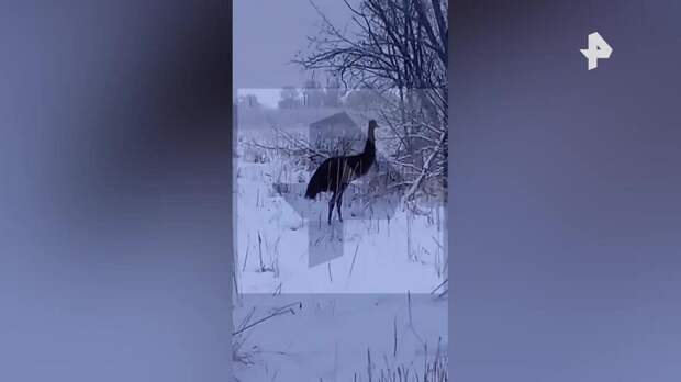 На кадрах видно, как страус находится среди снега в поле, а его пытается поймать женщина.