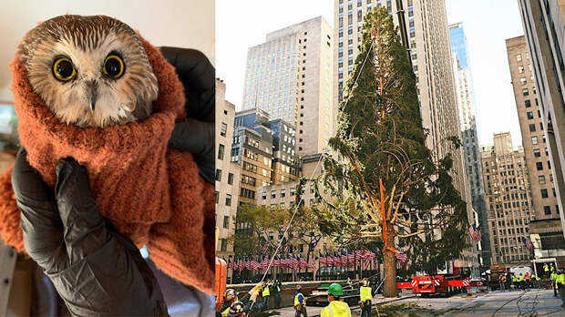 Специалисты обнаружили маленького совенка на ветке елки, которую привезли к Рокфеллер-плаза в Нью-Йорке. По всей видимости, малыш оказался в заложниках у дерева, преодолевшего длинный путь до места назначения.