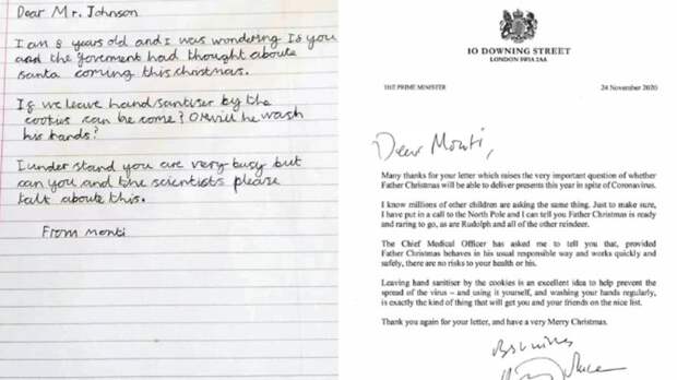 Обеспокоенный ребенок спросил у премьер-министра и правительства, сможет ли Отец Рождества прибыть к людям в это Рождество."Если мы оставим антисептик для рук у печенья, он может прийти? Или если он руки вымоет? Я понимаю, что вы очень заняты, но не могли бы вы и ученые поговорить об этом?" - попросил Монти.