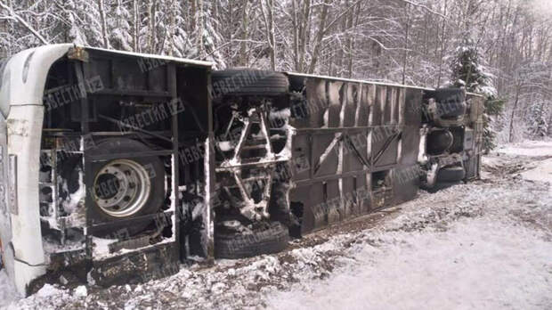 Как сообщалось ранее, водитель не справился с управлением на заснеженной дороге и съехал в кювет. На снимках видно, что автобус завалился набок.
