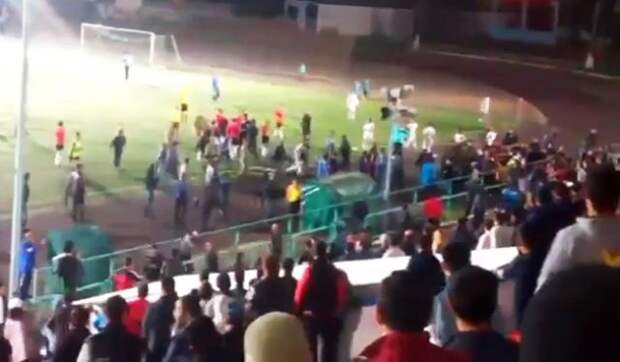 Через некоторое время на поле выбежали болельщики сначала одной, затем другой команды, после чего началась массовая потасовка.По предварительным данным, в ходе драки никто не пострадал.