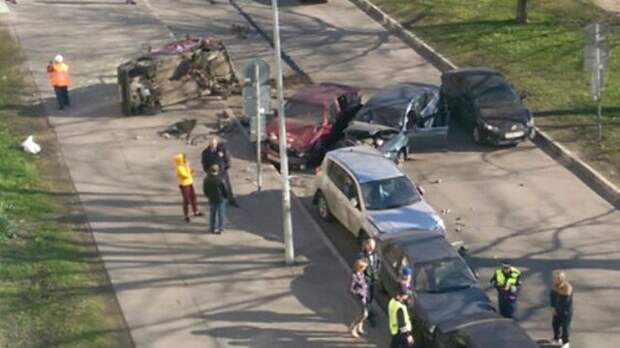 Серьезное ДТП произошло в Московском районе Санкт-Петербурга. У дома 21 на улице Космонавтов, как утверждают очевидцы, водитель "Ауди" протаранил около 10 автомобилей.